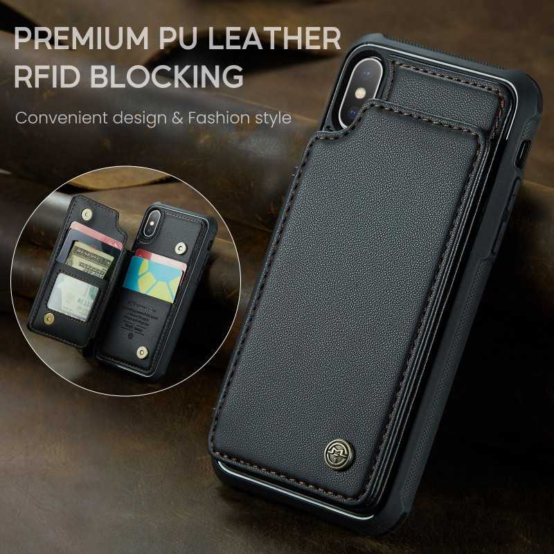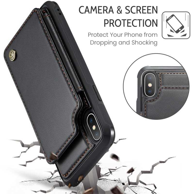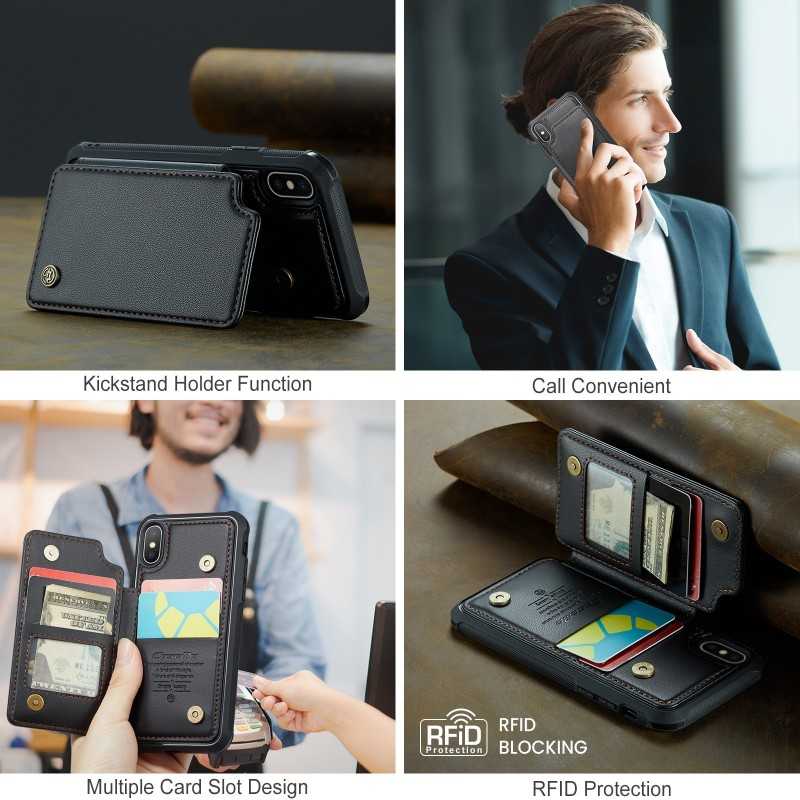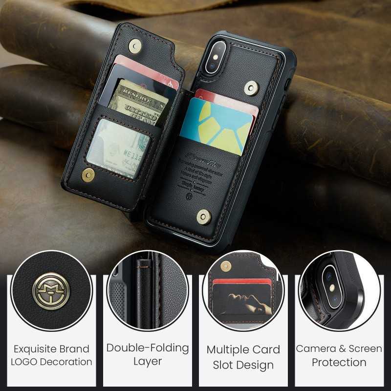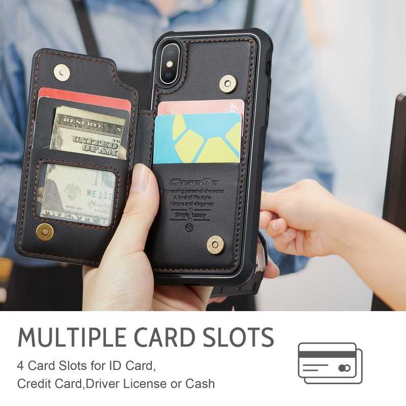 CaseMe Stöttåligt Skal Korthållare Stativ för iPhone XS Max erbjuder skydd, stil och praktiska funktioner med fyra fack för kort och sedlar.