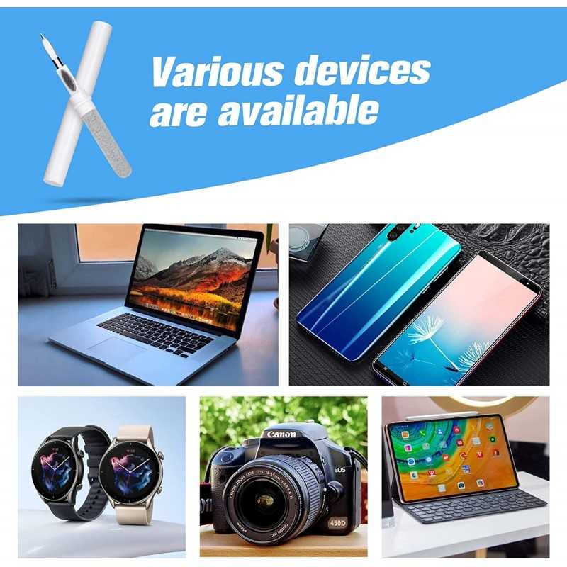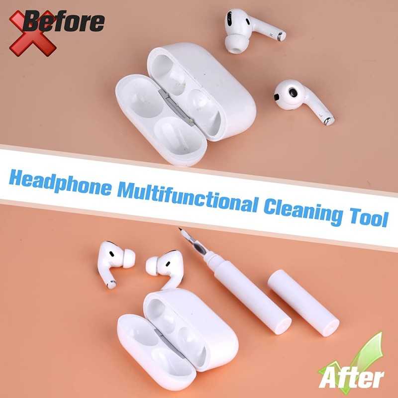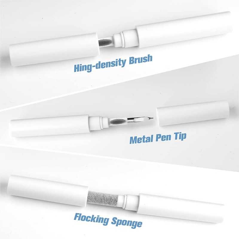 3-i-1 rengöringssats för bl.a. airpods, hörlurar och andra elektroniska enheter. Ta enkelt bort dam med metallrengöringshuvudet och sopa bort smutsen på hörlurarnas ljudhål med högdensitetsborsten Den flockande svampen kan absorbera och rengöra damm i den trådlösa laddningsboxen för hörlurar. Svampen är anpassad för att nå ner i t.ex. laddningsboxen för dina hörlurar.