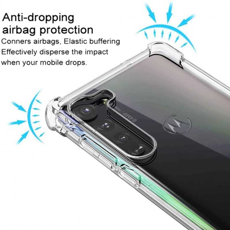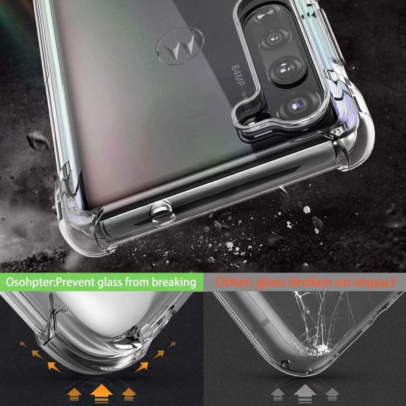 De fyra hörnen på skalet är konstruerade som en elastisk buffert som effektivt kan distribuera och därmed dämpa kraften från stötar, vilket skyddar din telefon från skador vid exempelvis fall. Den upphöjda ramen hindrar skärmen att komma i kontakt med en plan yta om telefonen placeras med skärmen nedåt.