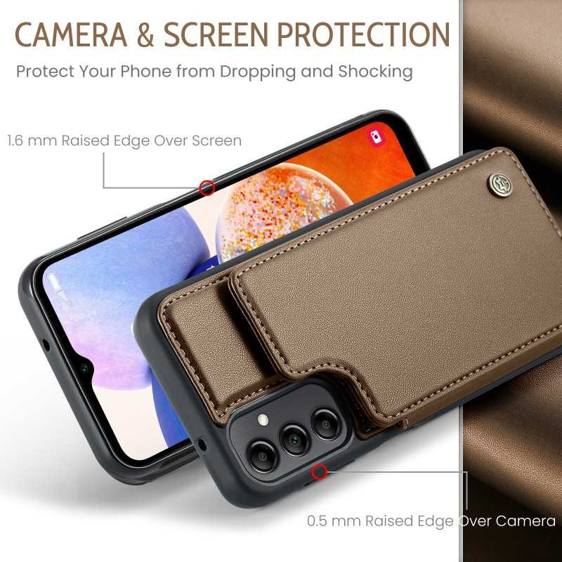 CaseMe stöttåligt skal med korthållare och stativ för Samsung A14 4G/5G i brun färg erbjuder både skydd och stil i en praktisk design.