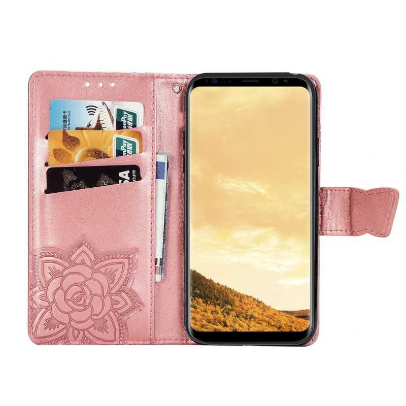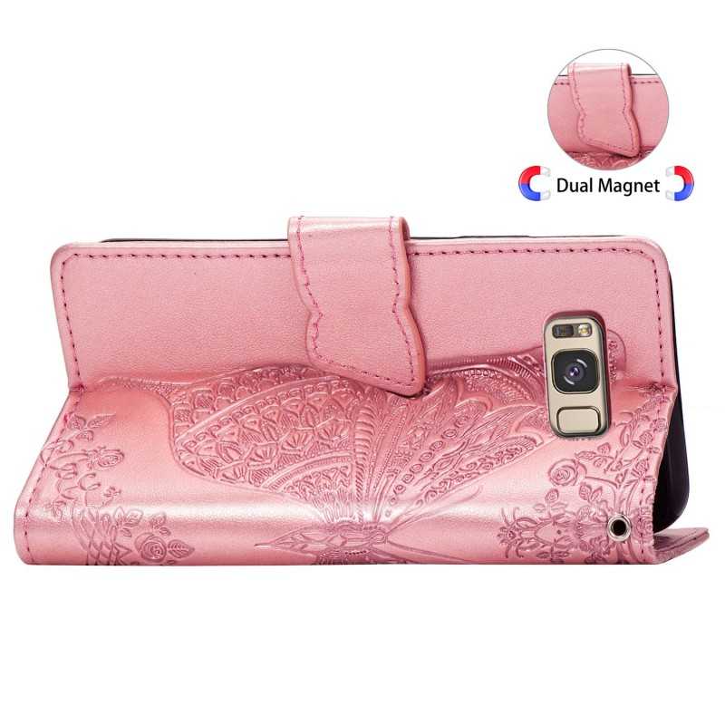 Samsung S9 Plånboksfodral i PU-läder med fjärilsmotiv erbjuder stil och funktionalitet med fyra fack för kort och kontanter. Skydda din smartphone med elegans.