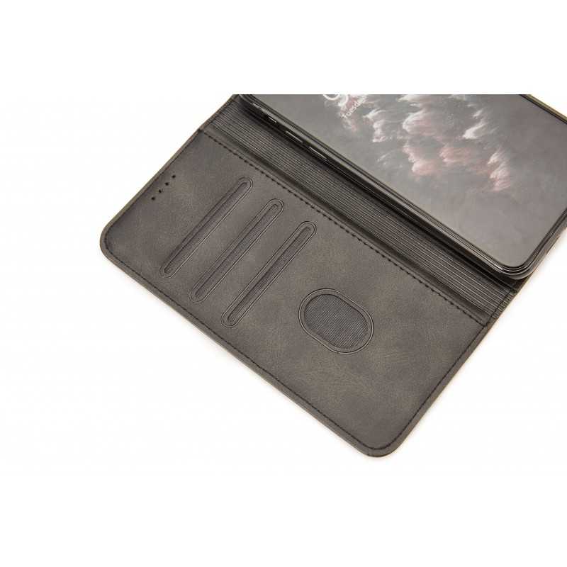 Mobilen sitter säkert i hållaren som är gjord av mjukplast och har hål för kamera, blixt och högtalare. Fodralet hålls stängd med en stark magnetlås. Det finns sammanlagt fyra fack. Tre för kreditkort/ID-kort samt ett för sedlar. Stativfunktionen gör så att du enklare kan titta på film/foto. Hålet i det transparanta kreditkort facket tillåter dig att enkelt ta fram ditt ID kort eller kreditkort med tummen.