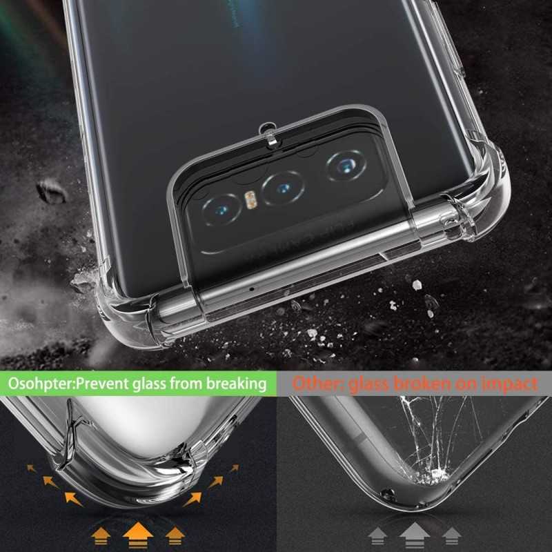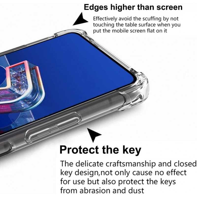 De fyra hörnen på skalet är konstruerade som en elastisk buffert som effektivt kan distribuera och därmed dämpa kraften från stötar, vilket skyddar din telefon från skador vid exempelvis fall. Den upphöjda ramen hindrar skärmen att komma i kontakt med en plan yta om telefonen placeras med skärmen nedåt.